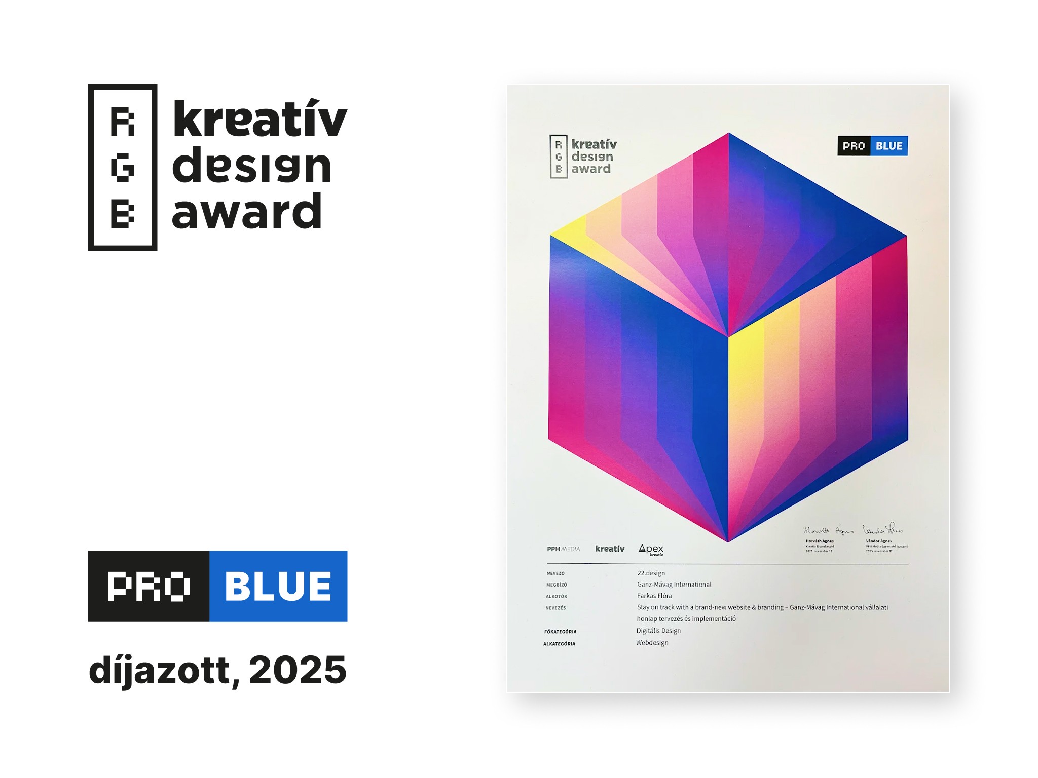 Hetedik éve kerül megrendezésre az RGB Kreatív Design Award, melyben csapatunk digitális design főkategóriában díjazott lett. A verseny célja, hogy felhívja a figyelmet a vizuális minőség jelentőségére azáltal, hogy a marketing és kommunikáció területének legkiemelkedőbb design megoldásait mutatja be.